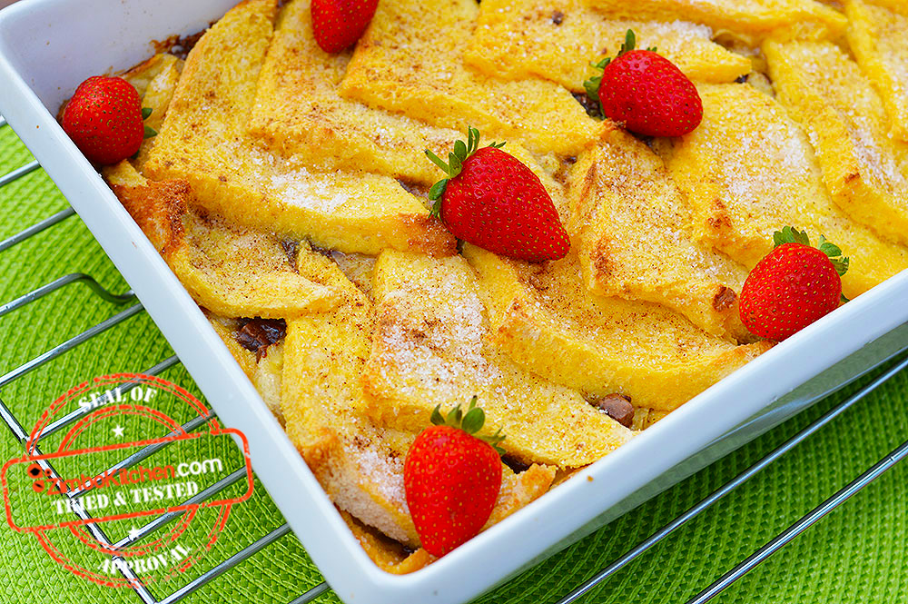 - Layer the bread in one single layer in whichever pattern you prefer at the bottom of the prepared ovenproof dish. Sprinkle the chopped chocolate evenly over it. Top with bananas then pour 100 ml fresh cream over this first layer.