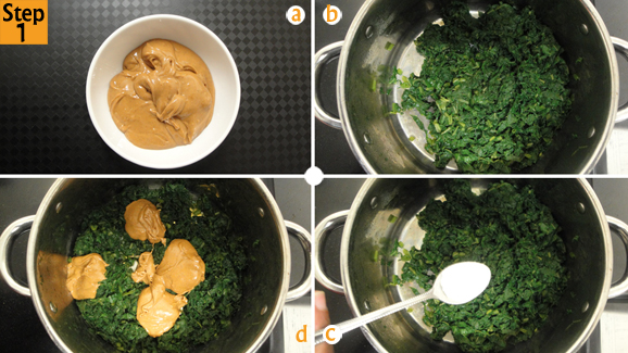 - With your peanut butter (3 heaped tbsp) ready and your muboora (1 bundle) returned to the pot. Turn off your cooker/stove and allow the residual heat to do the rest. Add salt (1 tsp), peanut butter and combine everything. There’s no need to let it simmer as you will kill all the nutrients you’re supposed to gain from the peanut butter!