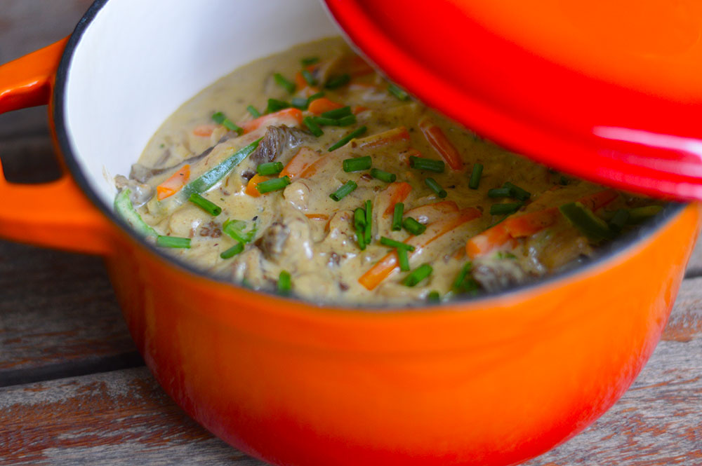 - In a separate bowl, mix 3 tbsp cream of mushroom soup powder or plain flour together with enough milk to make a paste. Stir and pour this into the beef and vegetables.