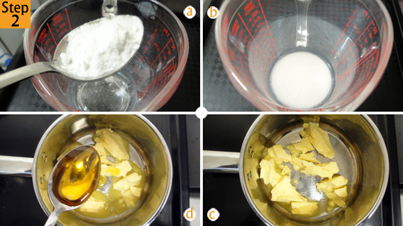 - Put your baking powder (1 tsp) in a jar, add the boiling water (2 tbsp) and stir. Put the margarine (100g) in a saucepan and add the syrup (1 tbsp toffee syrup).