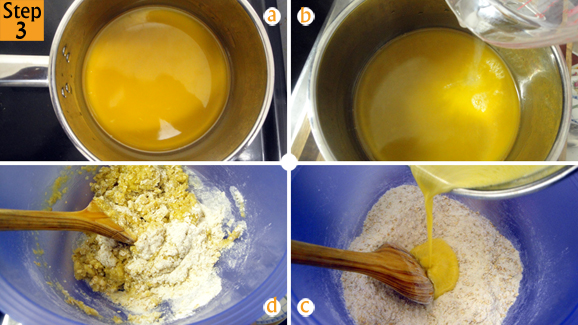 - As soon as the margarine melts remove saucepan from heat and pour the baking powder mixture. Take set aside bowl with dry ingredients and make a well in the middle. Whilst the melted margarine mixture is still warm immediately pour it into the bowl with dry ingredients. Mix until everything is just combined.