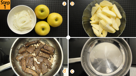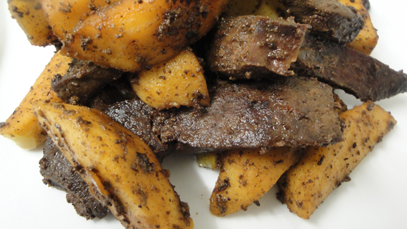 - Get your ingredients ready which are liver (500g), onion rings (1 small oion) and apples (3 apples). Peel, core and cut your apples into chunky wedges. Squeeze lemon juice (1/2 lemon) onto your apple wedges to prevent them from discolouring then sprinkle 1 tsp of sugar over them. Wash and cut your liver into long pieces. Heat oil in pan and fry your liver until it is well done. Remove from pan and place on a warmed up plate, season with 1 tsp salt then put in a warm place.
