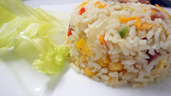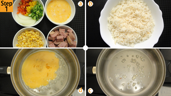 - Get your ingredients ready.Chopped red, green and yellow pepper (1/4 of each pepper bell), 3 eggs beaten, drained canned sweetcorn (1/2 can), chopped corned meat (1 tin) and cooked rice (8 cups). Heat oil in pan, add garlic (3 cloves, chopped) and swirl the pan to flavour the oil. Add eggs and fry until they are just about done.