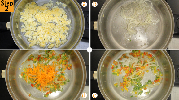 - When the eggs are done, remove them from pan and put in a plate and set aside. Add onions (1 onion, cut into rings) to the same pan and sweat them (30 seconds). Add the peppers and stir. Add the carrots (1/2 carrot, grated) right away and again, stir.