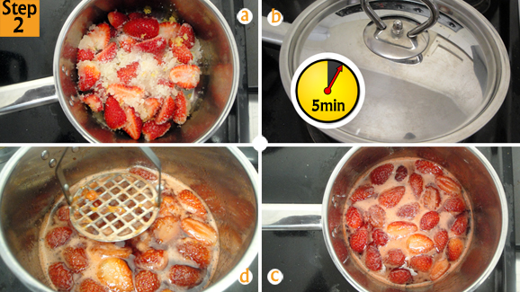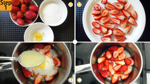 - With your ingredients ready; strawberries (250g), sugar (1/4 cup), lemon zest (1 tsp) and lemon juice (1 tbsp), wash and cut your strawberries in half. Place in saucepan, add sugar, lemon zest and lemon juice.