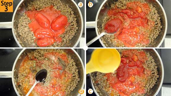 - Add the tinned tomatoes and tomato puree, water and salt, ground black pepper, dried mixed herbs and Worcestershire sauce.