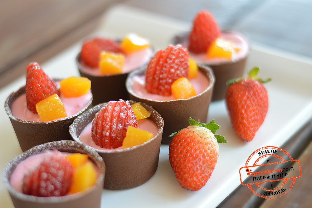 - Scoop some ice-cream into the chocolate cups, top them up with your preferred fruit, here I used fresh strawberries and tinned mixed fruit. Dust each cup with icing sugar just before serving. Enjoy!