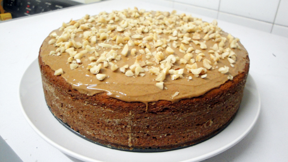 - Cook cake on cooling rack for 15 minutes before removing it from the tin. When cake is still slightly warm, spread some peanut butter on top and sprinkle the remaining chopped peanuts on top. Enjoy!