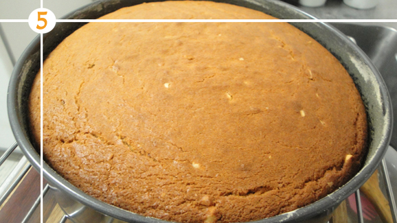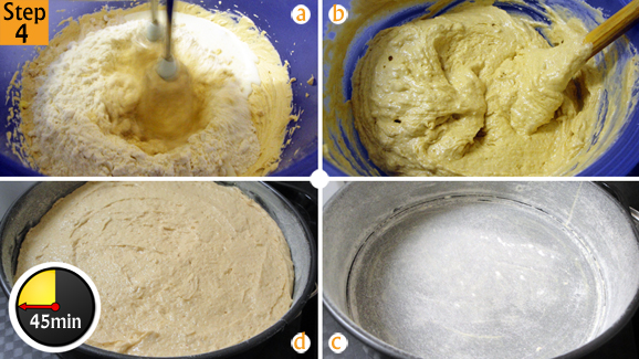 - Mix well then switch to using a wooden spoon. Add the rest of the flour and milk and mix well. Grease your baking tin and pour your peanut butter batter into the cake tin. Bake for 40-45mins or until skewer comes out clean when inserted into cake.
